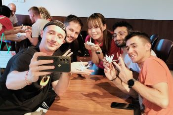 As part of the commemoration of the 80th anniversary of the dropping of the atomic bomb on Hiroshima, two students from the Department of International English, SO and MF, recently took part in the 「出張!折りづるひろば」event held in the "rest house" of Peace Memorial Park. Here they had the chance to interact with people from around the world, teaching them how to fold origami cranes.(原爆投下から80年となった今年の夏、国際英語学科の学生SOさんとMFさんが、平和記念公園レストハウスで行われた「出張!折りづる広場」に参加し、様々な国から訪れた人たちと一緒に折りづるを作りました。)