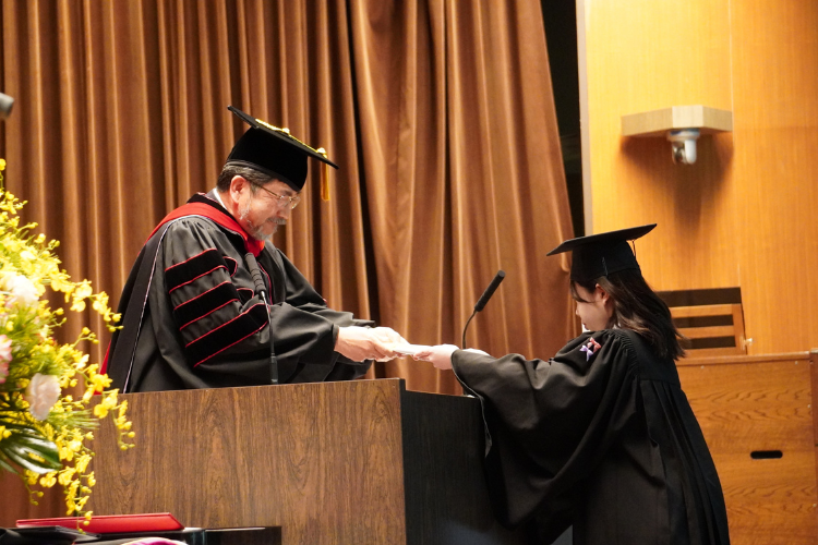 礼拝形式で行われる卒業式。卒業生はガウンと角帽を身につけます。