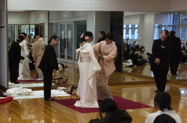 生活デザイン学科では様々な授業で学生が主体的に学べるような工夫をしています。今回は「日本服装史」で実施された白無垢着付けデモンストレーションの様子を報告します。