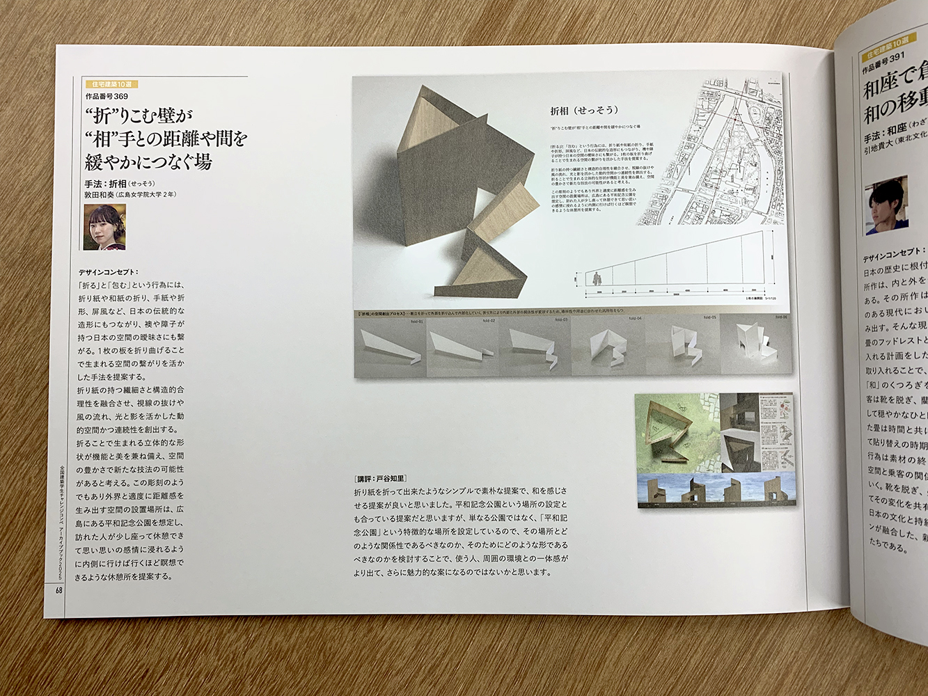 3月に行われた建築資料研究社主催の全国建築学生チャレンジコンペ「まだ名もない和の表現」で、生活デザイン学科3年生の敦田さんの作品「折相 -折りこむ壁が相手との距離や間を緩やかにつなぐ場」がファイナリストに選定され、掲載された「アーカイブブックス2025」が発刊されました。