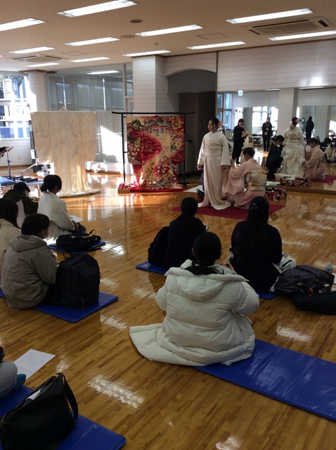 授業ではなかなか学ぶことができない着付け小物や、美しく見える着付け方、花嫁衣裳クイズ、花嫁衣裳小物など丁寧にわかりやすくお話しくださり、学生も熱心にメモを取っていました。また、後半の自由に見学してよい時間には、大林様や濱田先生だけでなく、一緒においでくださったヘアメイクの方や和プロデュースのスタッフの方にも積極的に質問があったようで、あっという間の90分でした。