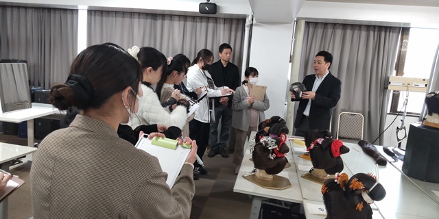 かつらの作り方や種類、かんざしの素材やモチーフの意味などを丁寧に教えていただき、学生たちも真剣にメモを取っていました。