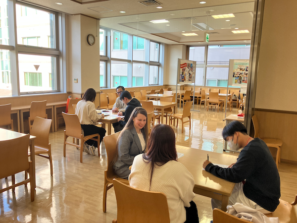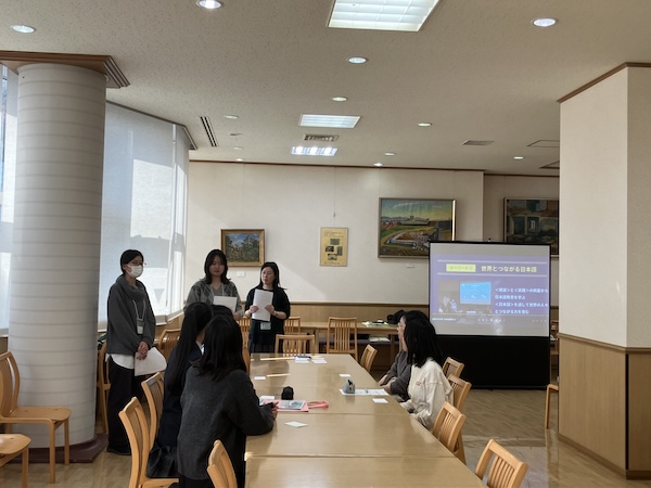 日本語教育コースからは、日本語教員を目指す学生たちが、今までの学びを活かして、日本語を教えること、学ぶことを体験する授業を企画してくれました。在学生の留学生も加わり、日本語を学ぶ経験や自国の言葉の話を通して、各国の言語の違いについても発見があったようです。