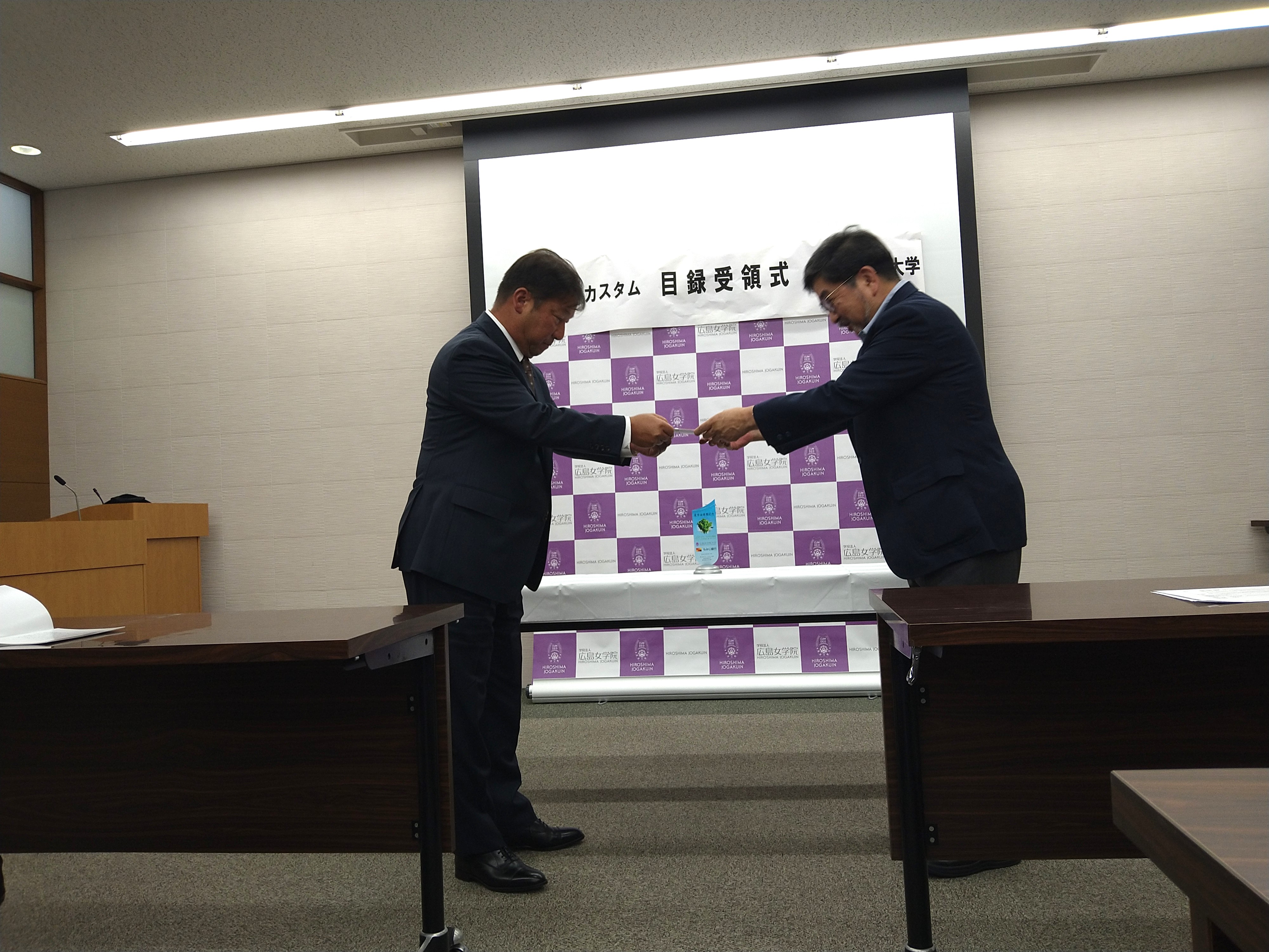 7月18日、(株)アド・カスタム岡本様からの目録受領式が、広島女学院大学にて執り行われました。