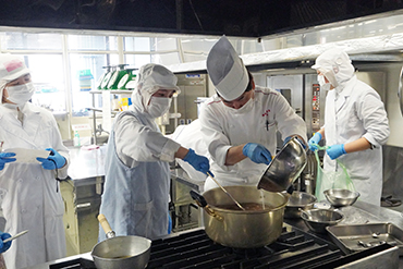 学生たちは、自分たちが考えたメニューが実際に提供されることもあり、味つけや盛り付けまで細かく確認しながら調理を進めることで、よい学びの時間になったようです。