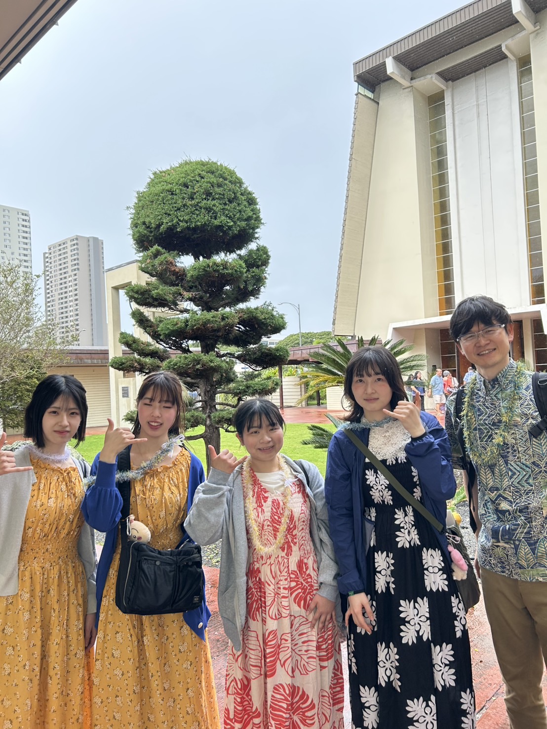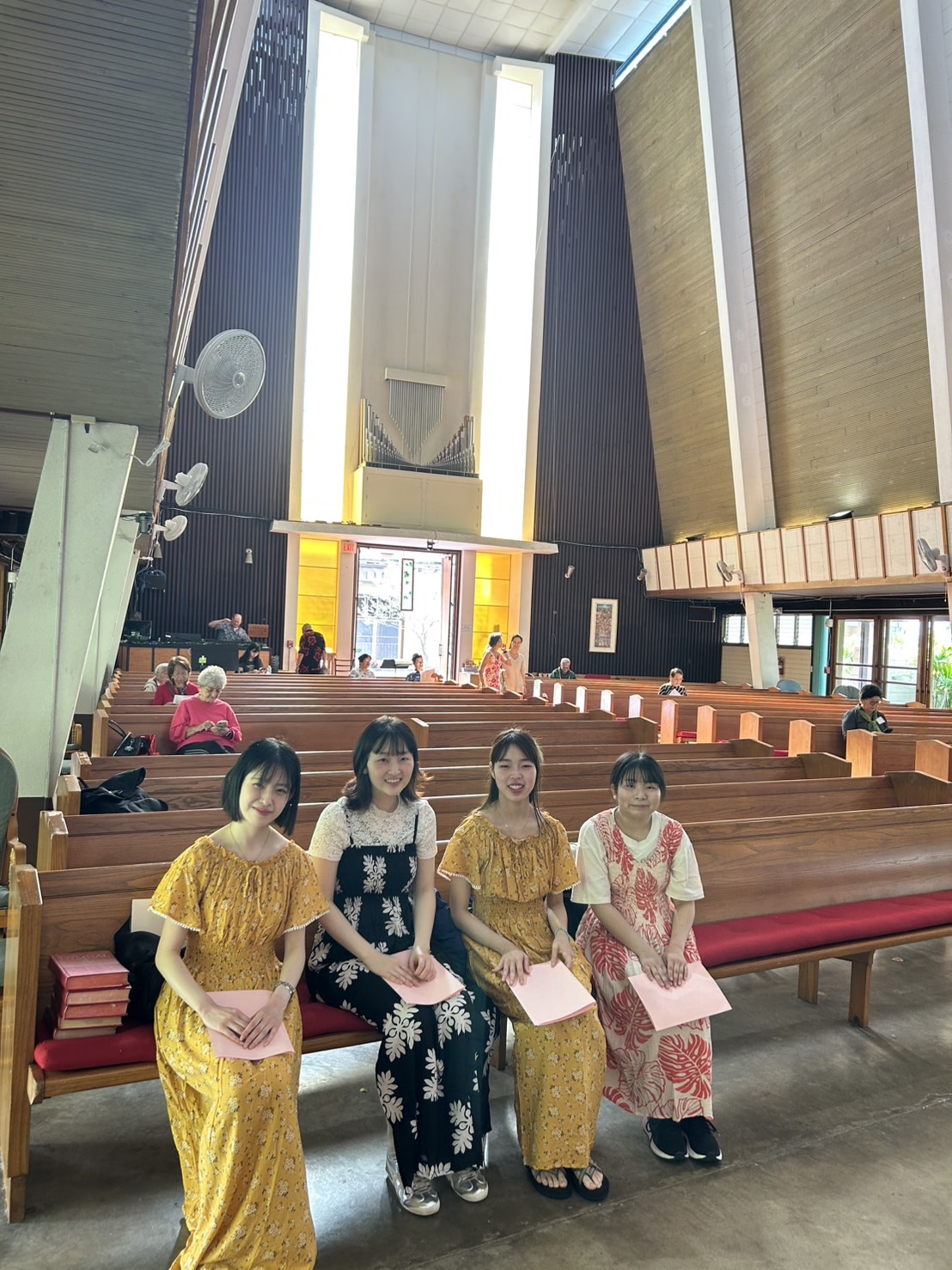 ハワイでのフィールドワークも中盤となり、ハワイに少し慣れてきました。本日は、ハリス教会での日曜礼拝があり、ムームーを着て参加しました。はじめは緊張していましたが、現地の方の歌を英語で聴いて、とても安らぎを感じました。実際に賛美歌を歌った時は緊張しましたが、これまで歌のご指導をしてくださった先生やあたたかく迎えてくださった教会の方々のおかげで、落ち着いて丁寧に歌うことができ、心に残るとても良い経験となりました。また、日曜礼拝の後には、私たちの日曜礼拝の参加に携わってくださった方と食事をしました。ここでは、ハワイでの出来事や日本の音楽、折り紙などについての会話をしながら食事をしました。とても楽しい時間を過ごすことができ、よかったです。