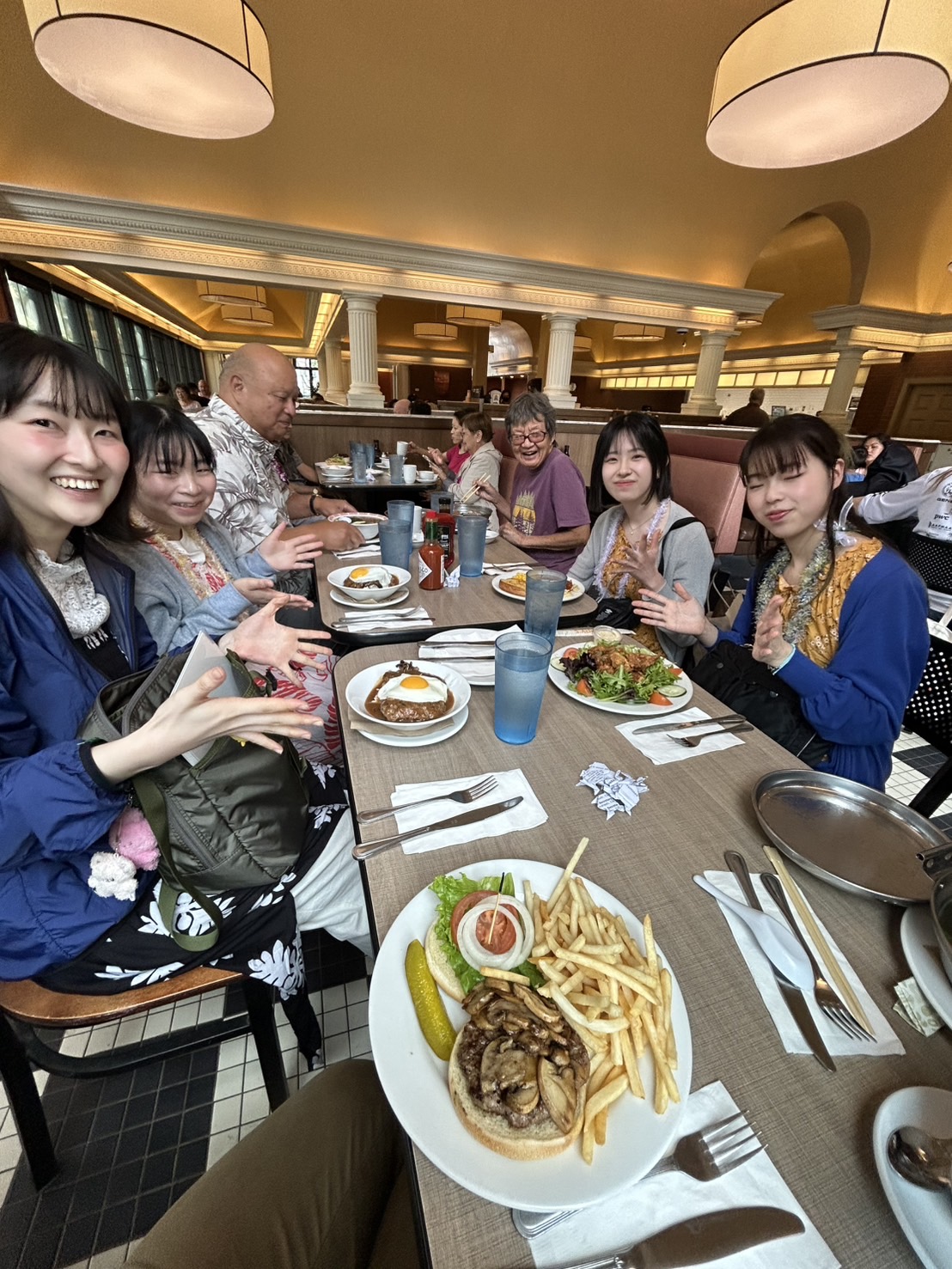 今日の朝はハリス教会の日曜礼拝で賛美歌を歌いました。途中少しハプニングがありましたが、教会の方々がとても親切にしてくださって目的地までたどり着くことができました。ハリス教会に着いた後は、早速賛美歌の練習を何度かしました。前に立って歌うのは緊張しましたが、練習ができたので安心しました。本番では、歌い終わったあと、皆さんが拍手をしてくれたので、うれしかったです。その後、教会の皆さんとお昼ご飯を食べに行きました。食事を待っている間、折り紙でぴょんぴょんカエルを作りました。私よりも海外の方々のほうが、折り紙を上手に折って作っていたのですごいなと思いました。途中に少し会話もして楽しかったです。お昼ご飯はロコモコを食べました。とても肉肉しくて美味しかったです。やはり日本のロコモコとは食材も違い、味が濃いように感じました。夜ご飯にポキ丼を初めて食べたのですが、とても美味しかったです。パイナップルもよく合いました。ハマりそうです。ジェラートも食べてハワイの食事を満喫しました。 (管理栄養学科 Fさん)