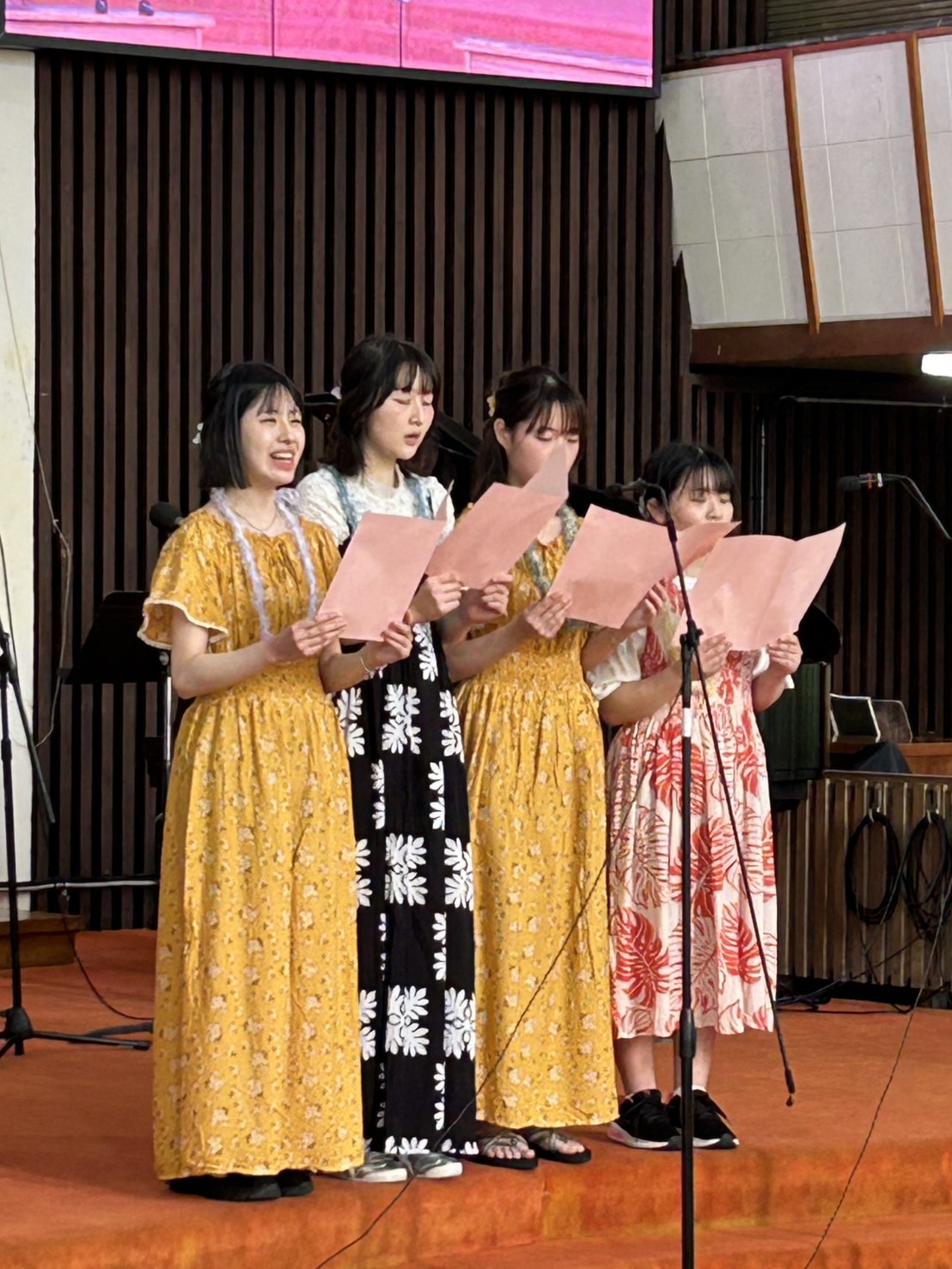 礼拝の終盤には、本学学生がステージに登壇し、ハワイの正装であるムームーを着て讃美歌312番「いつくしみ深き」を披露しました。