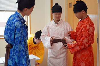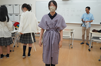 さらに、実際にレプリカ衣装を身につけて、色や形状の違い、布の長さや動きやすさを体感しながら、当時の身分制度や生活様式への理解を深めました。