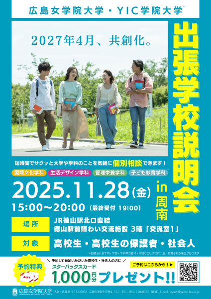 「徳山駅前賑わい交流施設(3階)」で、広島女学院大学とYICグループの専門学校が合同説明会を開催します!