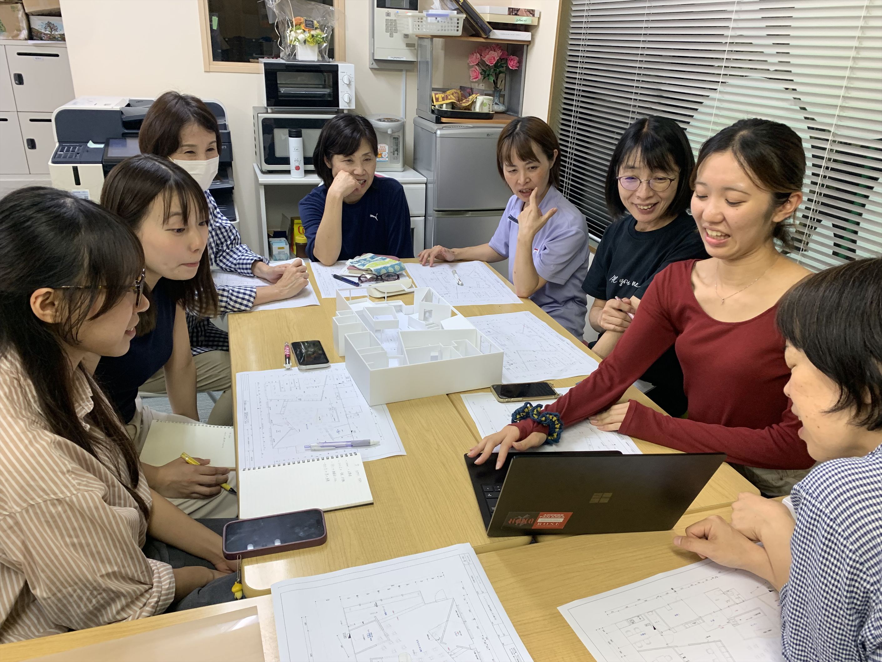 10/1(水)に行われた打ち合わせでは、陽だまりの関係者と広島大学 石垣ゼミの学生とともに、模型を見ながら具体的な設計案を議論。