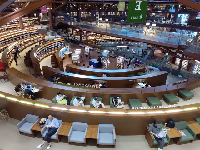 夕方、金沢に入り、斬新な建築で有名になった石川県立図書館を見学しました。蔵書検索をして、実際に本を探してみて、利用者の側の使い勝手も体験してみました。円形の閲覧室は開放的ですが、1冊の本にたどり着くのに場合によっては半周しなければならず、複数の本を同時に探す場合には歩き回らないといけないことがわかりました。また、図書館司書の方も利用された本を書架に戻すのに階層を移動したり、円周をぐるっと回ったり、苦労もあるのではないかと想像しました。