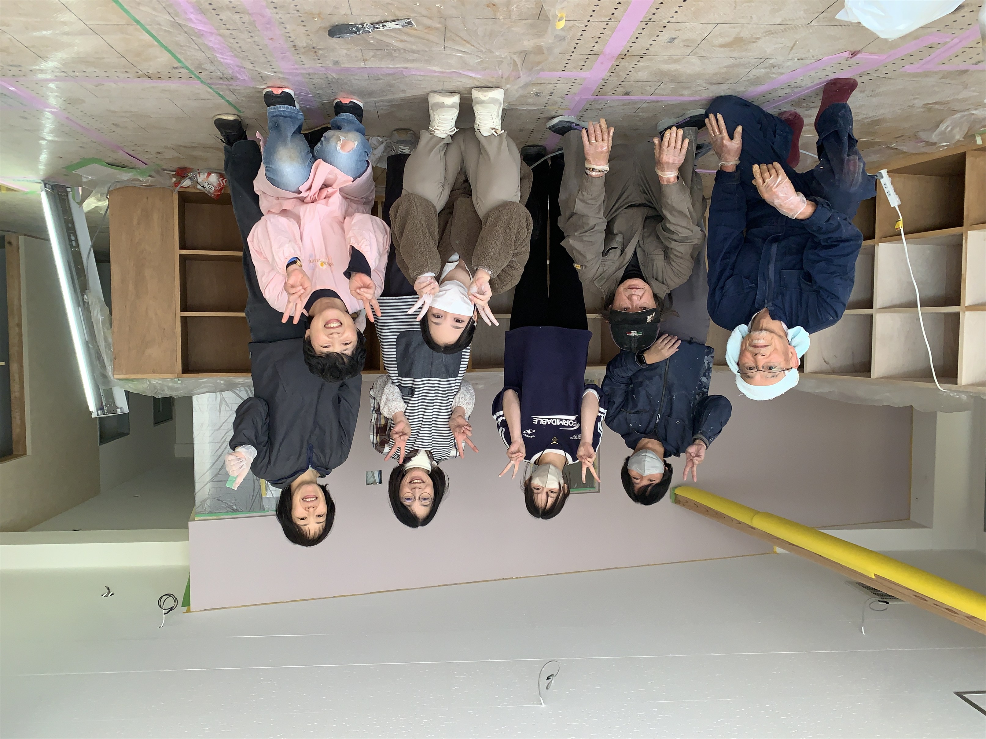 2月24日、室内の最終仕上げとなる「塗装ワークショップ」を実施しました。当日は、生活デザイン学科の学生(香本さん・堀井さん)に加え、陽だまりのスタッフの皆さま、広島大学 石垣先生とゼミ生の皆さん、そして日頃から活動を支えておられる地域の方々など、多くの方にご参加いただきました。
