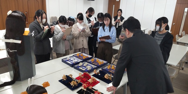 かつらの作り方や種類、かんざしの素材やモチーフの意味などを丁寧に教えていただき、学生たちも真剣にメモを取っていました。