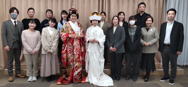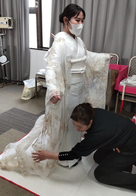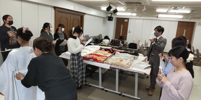 2社目は「あゆみブライダル」様です。京都で婚礼用の衣装レンタルをしている企業で、こちらも婚礼用の白無垢、打掛、振袖など、多種多様な衣装をお持ちくださいました。