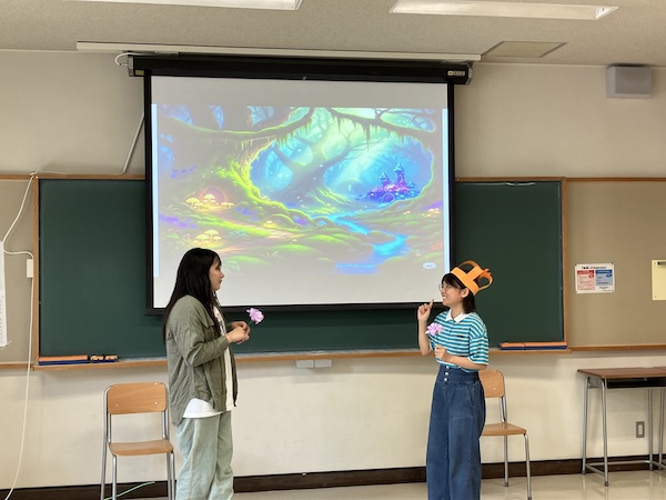 迎えた上演当日。学生たちは皆緊張していましたが、一人ひとりが、自分のキャラクターを演じ、最後まで演じきることができました。さらには背景画や音の切り替えなどの裏方も務め、一人が何役もこなして協力しながら上演を完成させました。