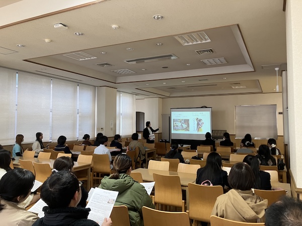日本語教育コースからは、日本語教員を目指す学生たちが、今までの学びを活かして、日本語を教えること、学ぶことを体験する授業を企画してくれました。在学生の留学生も加わり、日本語を学ぶ経験や自国の言葉の話を通して、各国の言語の違いについても発見があったようです。
