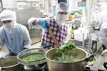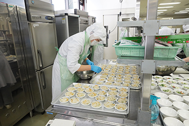 大量調理では、一人の動きが全体に影響するため、声を掛け合いながら進めることがとても大切です。