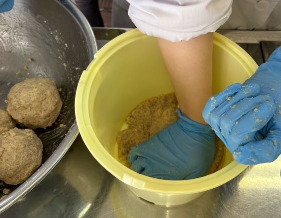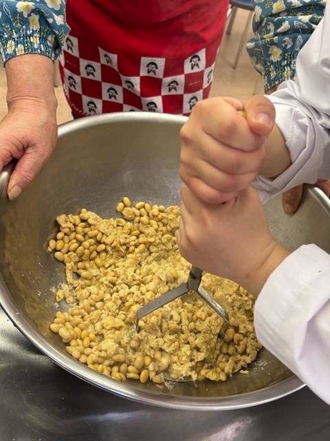 今回は「合わせ味噌」と「米味噌」の2種類を仕込みました。圧力鍋で蒸し上げた大豆をマッシャーで細かくつぶす工程は、想像以上に力が必要で、学生たちは一生懸命取り組んでいました。