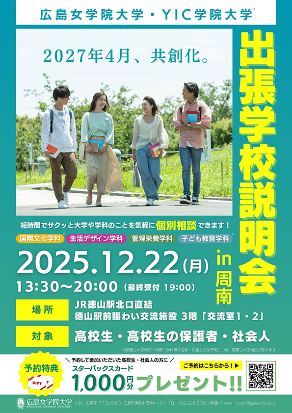 12月22日(月)13:30~周南で「出張学校説明会」を開催します!徳山駅北口すぐ!「徳山駅前賑わい交流施設(3階)」で、広島女学院大学とYICグループの専門学校が合同説明会を開催します!