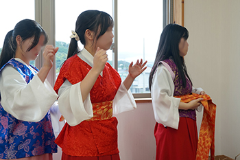 さらに、実際にレプリカ衣装を身につけて、色や形状の違い、布の長さや動きやすさを体感しながら、当時の身分制度や生活様式への理解を深めました。