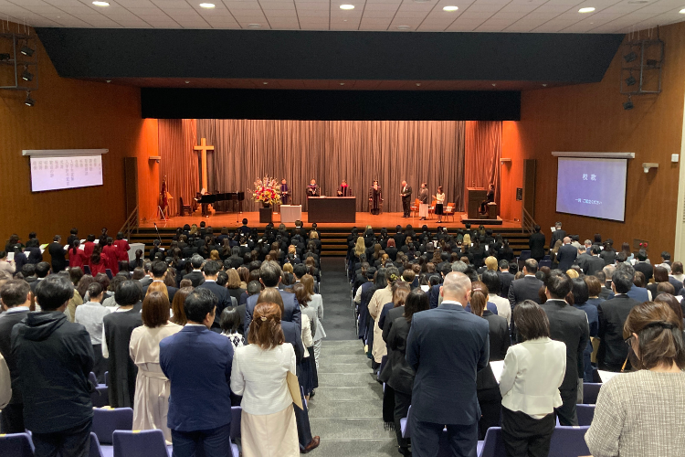 礼拝形式で行われる卒業式。卒業生はガウンと角帽を身につけます。